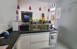 Cozinha conceito aberto, balcão, repleta de armarios, Cooktop, forno embutido e coifa. Piso em porcelanato.